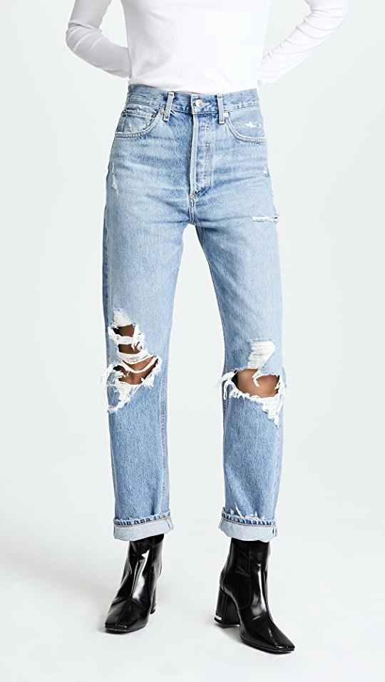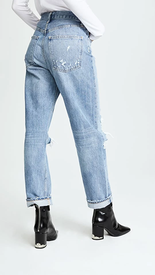 - Distressed patches and raw cuffs