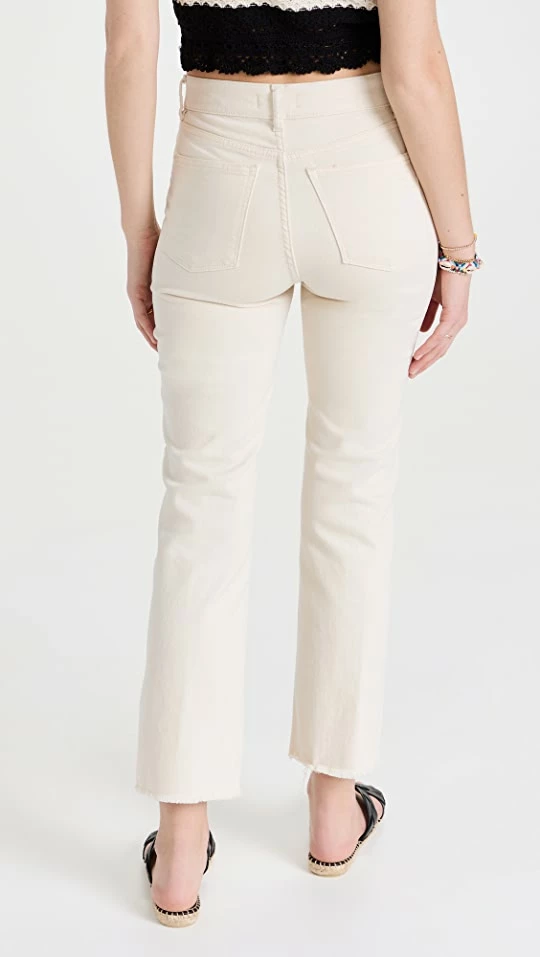- Straight ankle-length silhouette with frayed hems